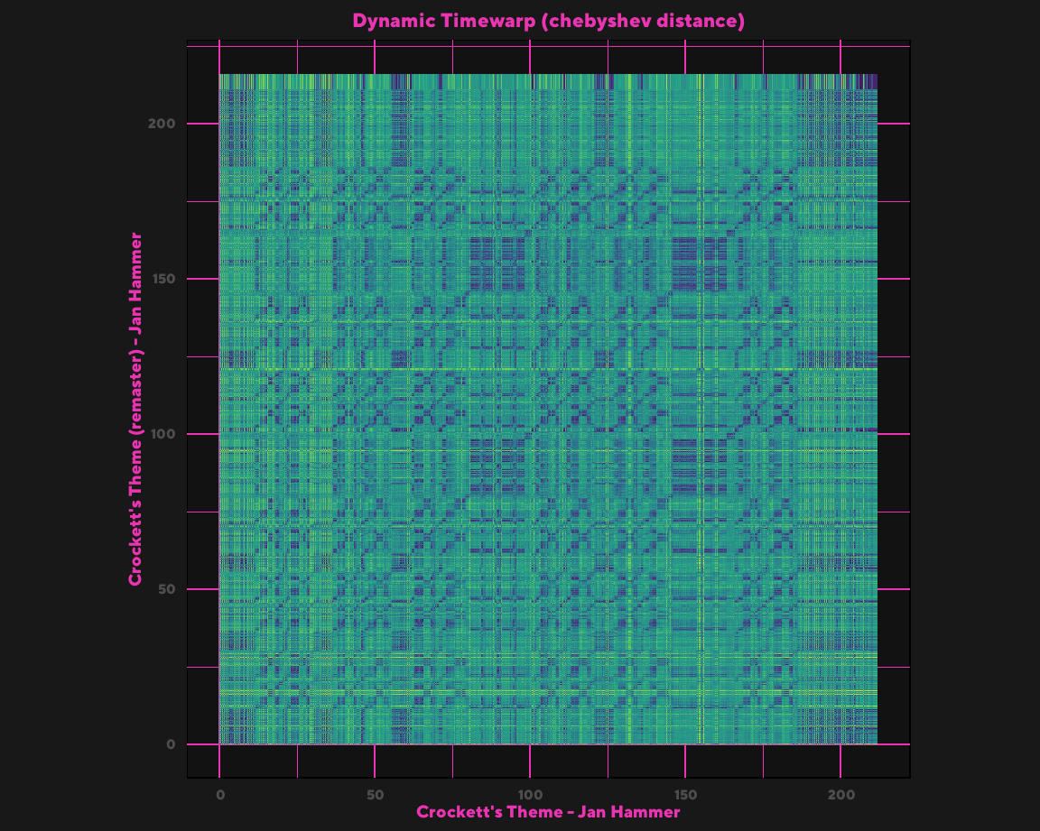 The plot shows that the original and the remastered soundtrack are indeed very similar. This is visible by the diagonal line in the plot. Both tracks have very similar structure and duration, so this makes sense. In some spots the diagonal line becomes less clear, like the first ten seconds of the plot. Here we see a more distorted checkerboard pattern. When listening to both tracks this difference is noticeable, primarily in volume. The overall structure of the song does not change, so this block is not fully distorted in the plot. The end of both tracks also feature similar distortion, which is not unexpected. The beginning and end of both tracks are very similar for each track.