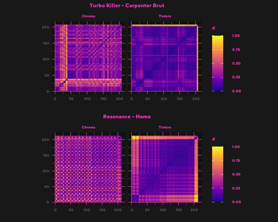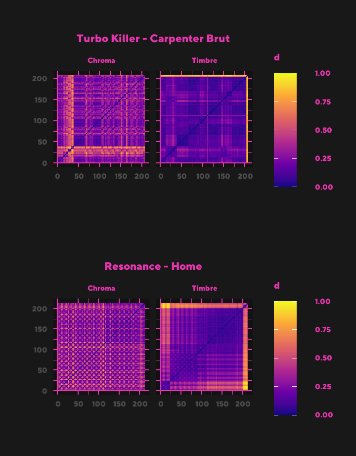 I wanted to explore the song Turbo Killer by Carpenter Brut, which is one of my favorite tracks in the corpus. I believe this is due to the buildup and pacing that the track has. Resonance does not have any of these features, which would imply that the Self Similarity Matrices should be different.
